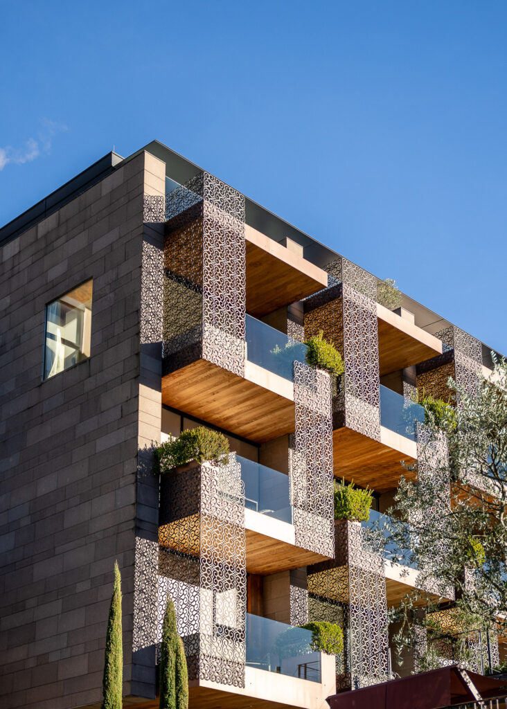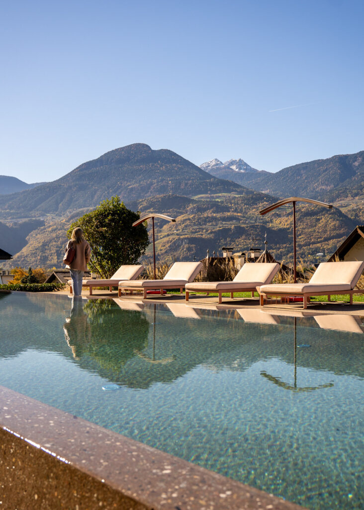 Das Muchele lebt von seiner architektonischen Nonchalance: der neue Sole Infinity-Pool aus Südtiroler Porphyr, der Drinnen und Draußen verschmelzende Garten, die behagig-modernen Zimmer, die mutigen Farbakzente. Ein Ort, der Menschen erdet – und Kreativität hebt.