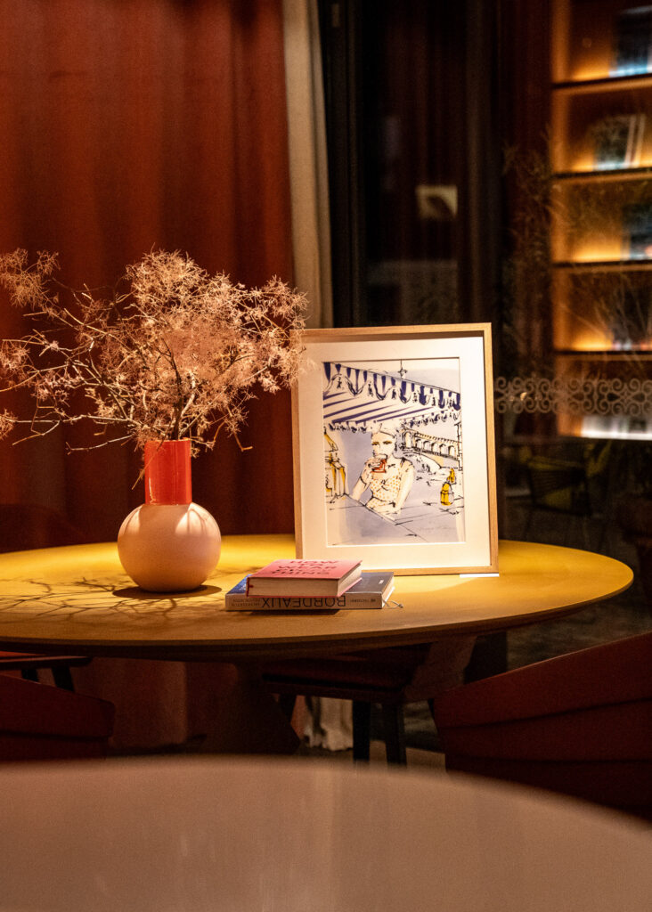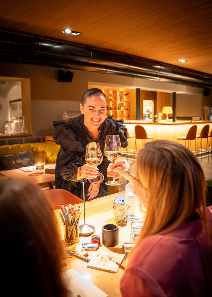 Nadjas Arbeiten kreisen um Weiblichkeit, Stärke und Sensibilität. Linien, die wie Bekenntnisse wirken, Farben, die wie Stimmen sprechen. Im Muchele begegnen sie einem Interieur, das ebenso von Frauen geprägt ist – von Visionärinnen, die Gastfreundschaft neu denken, Architektur spürbar machen und Design zum Lebensgefühl erheben.